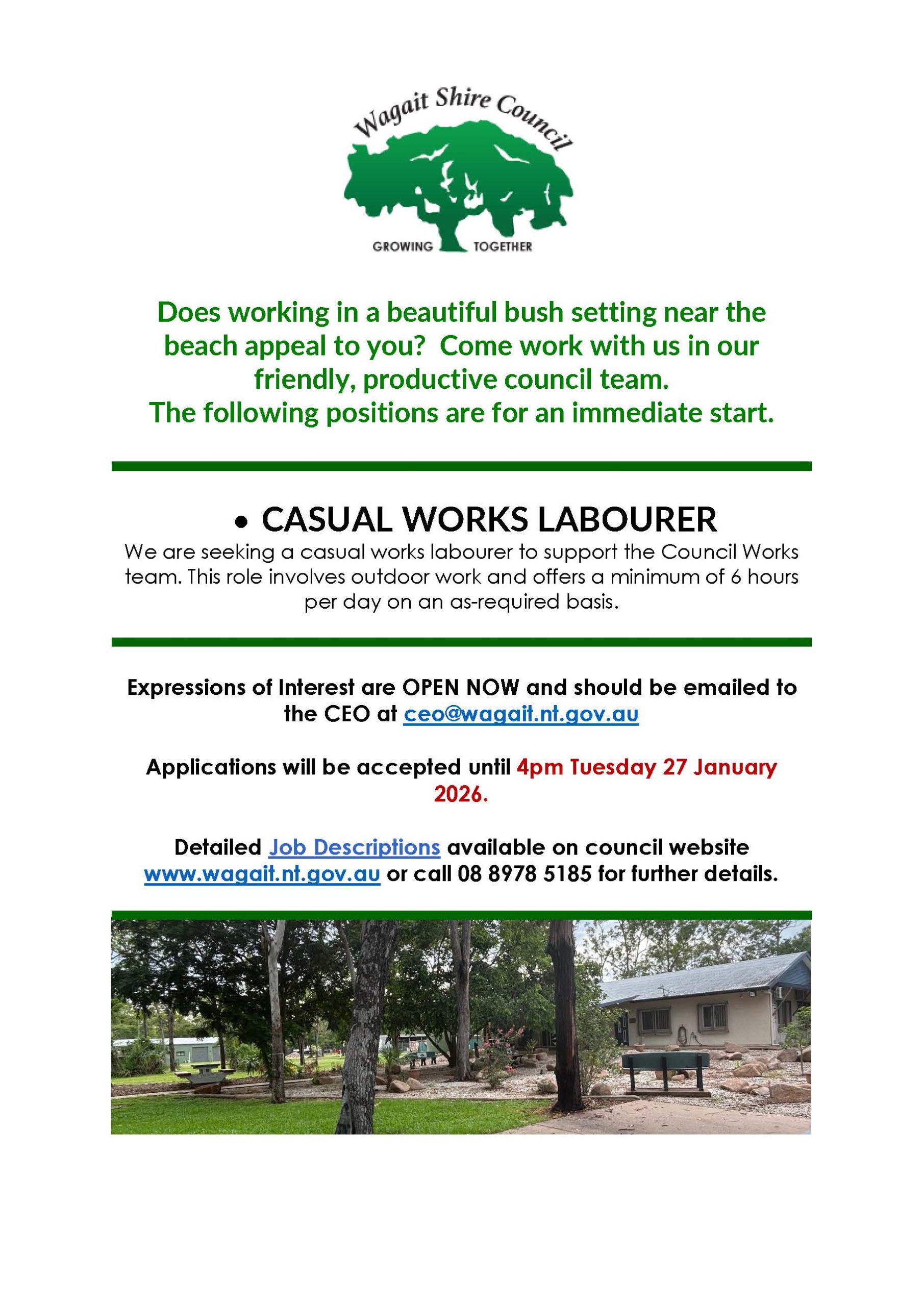 OPPORTUNITIES THE FOLLOWING POSITION IS CURRENTLY AVAILABLE WITH COUNCIL Casual Works Labourer WSC-JD Casual Labourer Jan 26 Copyright Wagait Shire Council 2021